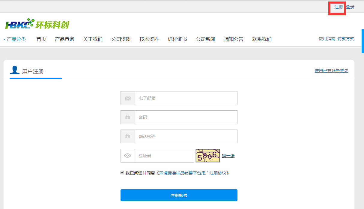 答:打開網頁后,請點擊頁面右上角“注冊”項注冊新會員,*為必填項,一個郵箱只能注冊一個賬戶。您注冊成功后,環標科創商城將為您開通一個賬戶,作為您在環標科